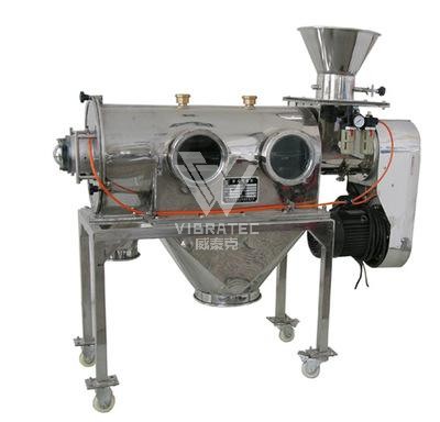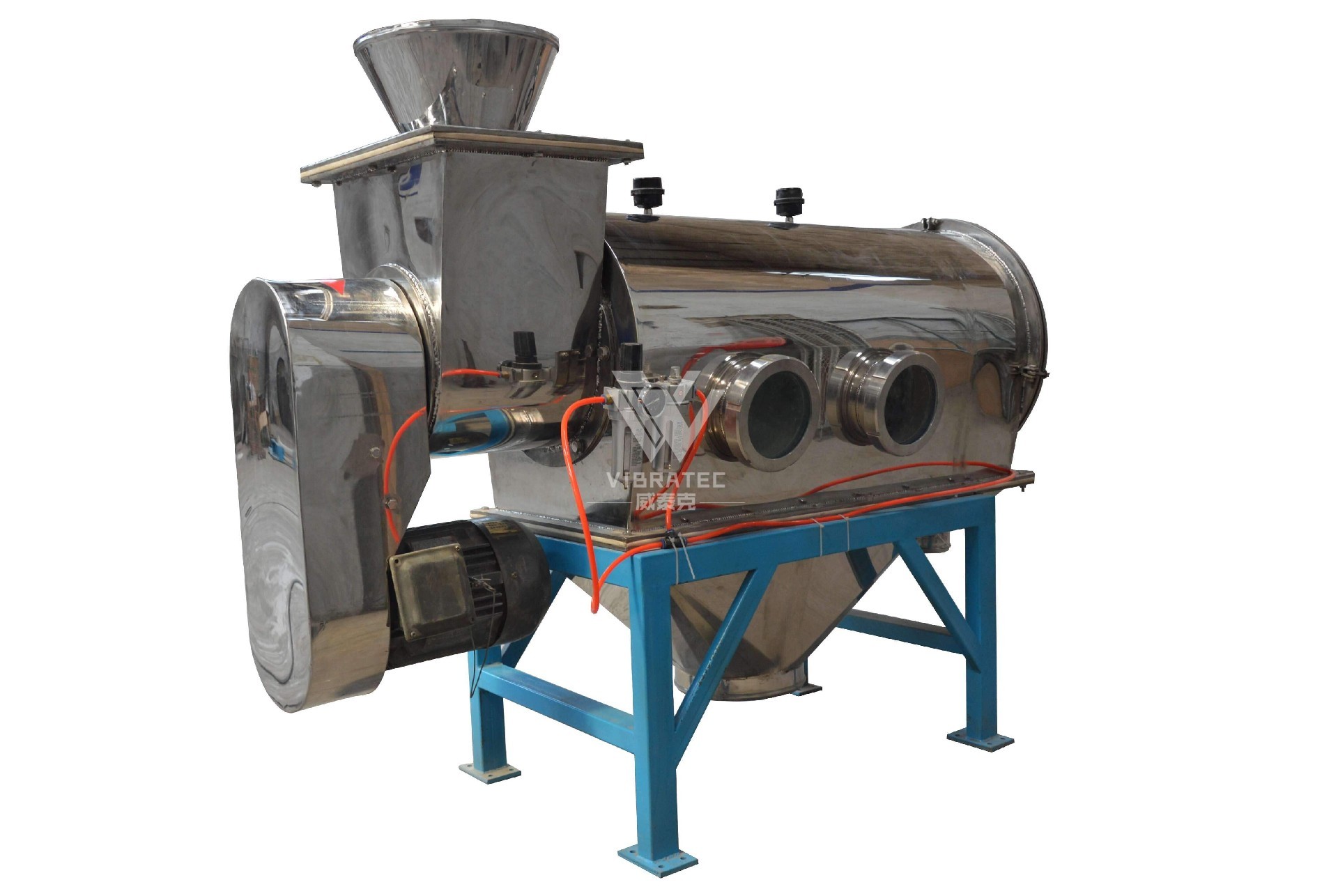 WQS氣流篩的篩網(wǎng)為圓筒狀,置于機(jī)體內(nèi),物料通過螺旋輸送系統(tǒng)后,與氣流混合、霧化進(jìn)入網(wǎng)筒內(nèi),通過網(wǎng)筒內(nèi)風(fēng)輪葉片的高速旋轉(zhuǎn)使物料同時(shí)受離心力和旋風(fēng)推進(jìn)力,從而使物料噴射過網(wǎng),過網(wǎng)的物料由細(xì)料出料口排出,不能過網(wǎng)的物料沿網(wǎng)筒壁從粗料出料口排出,達(dá)到快速分離的目的。